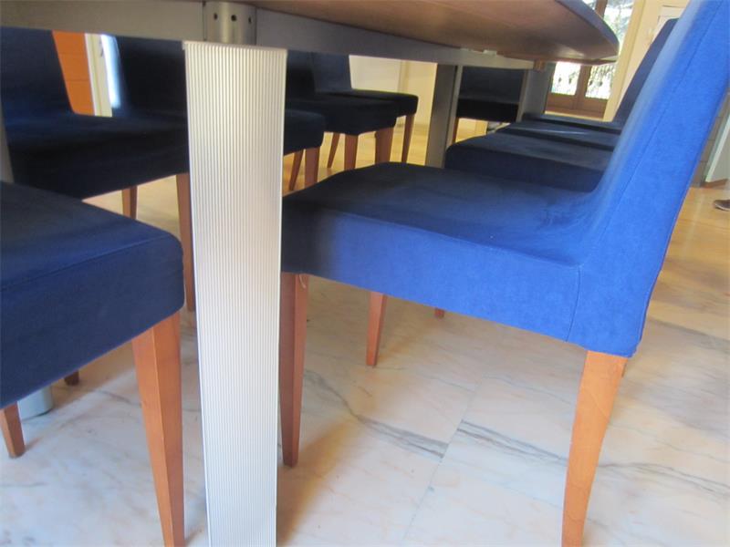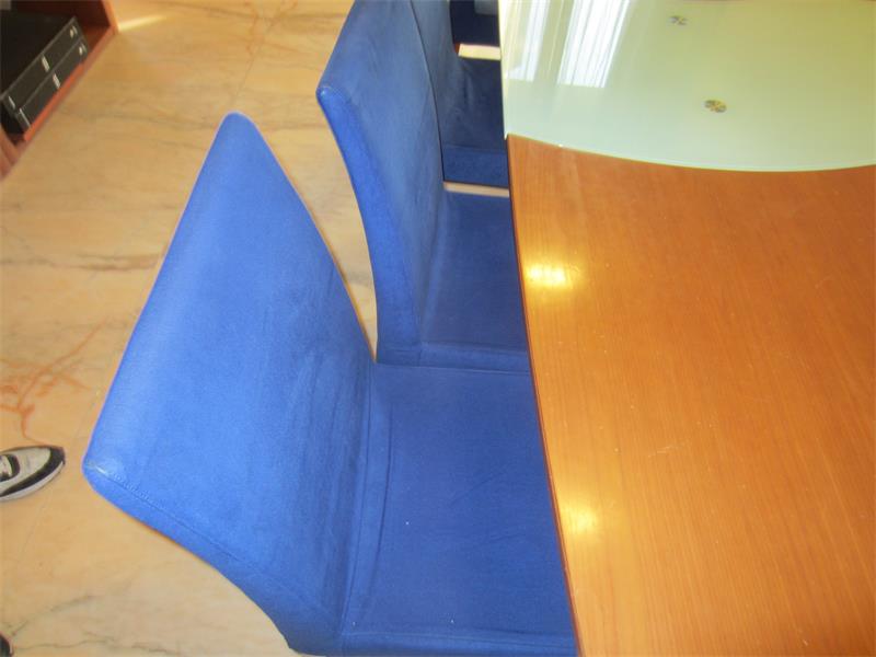 18/2025 - tavolo ovale in legno ed inserto in vetro color verde chiaro e 10 poltroncine in tessuto color blu